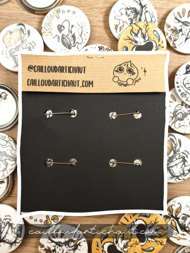 Tous les badges sont fabriqués à la main par mes soins. Ils font tous 38mm de large avec un dos métallique et une opercule en plastique transparente pour préserver le dessin imprimé. Vous pouvez les accrochez sur vos sacs, trousses ou encore vestes en toute sérénité.
