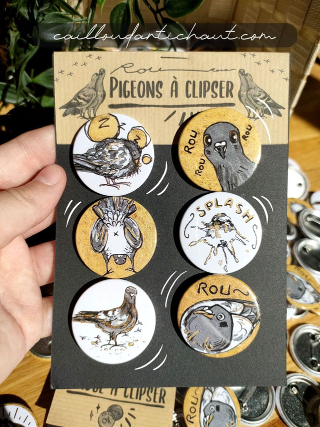Découvrez une sélection de 2 badges issus aléatoirement de la collection "pigeons à clipser" pour une touche d'originalité sans pareille !
