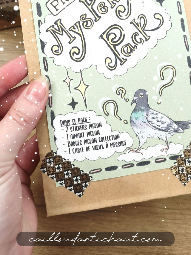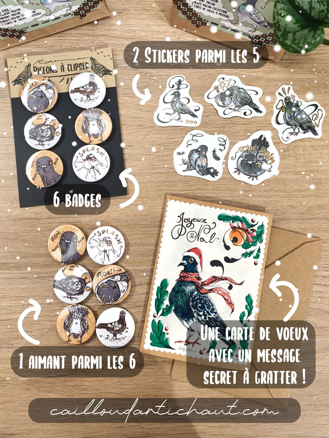 Chaque pack mystère contient : la collection complète des 6 badges pigeon, 2 stickers pigeons, 1 aimant pigeon et une carte de vœux pigeon avec un message à gratter à l'intérieur !